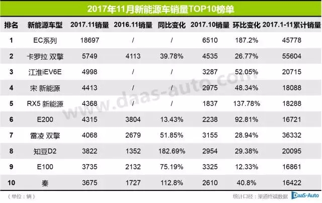 同样,11月新能源汽车市场的表现相当抢眼,前十车型的销量环比均实现了两位数增长,甚至有翻倍增长。其中,EC系列环比增长187.2%,以18697辆的成绩霸占第一名,是唯一一款销量过万辆的新能源汽车,不过当月有7款新能源汽车的销量都超过4000辆。