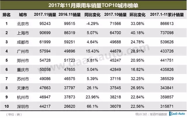 达示数据显示,乘用车仍高度集中在北上广等一线城市。11月份,前十大城市乘用车的销售表现较10月都有非常显著的提升,环比增幅都达到了两位数。其中,北京和上海两大城市的乘用车成交量均在9万辆以上,不过北京市同比有小幅下滑趋势。