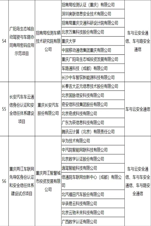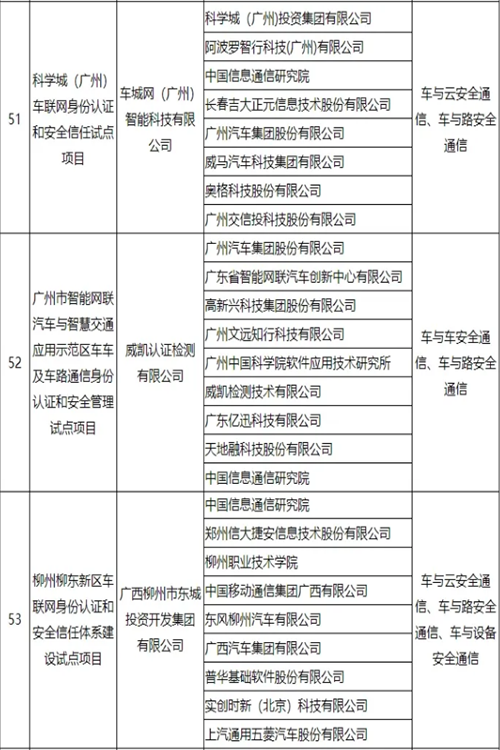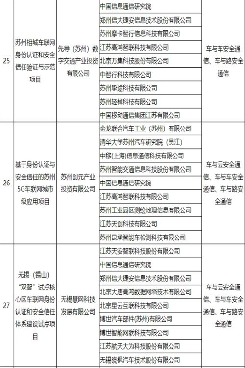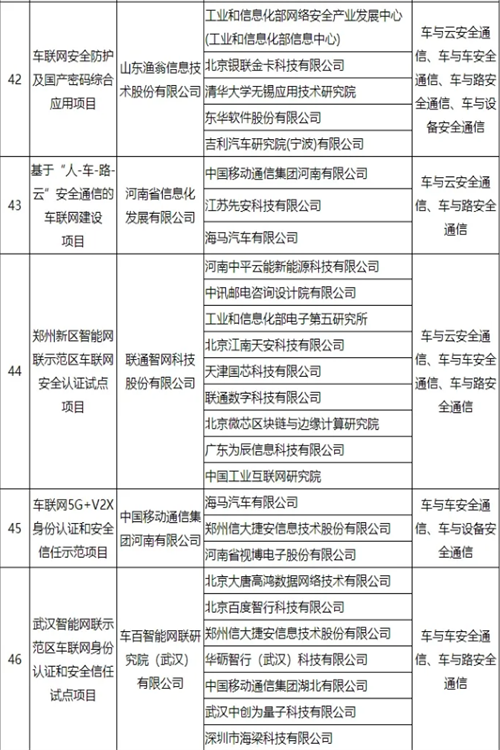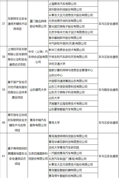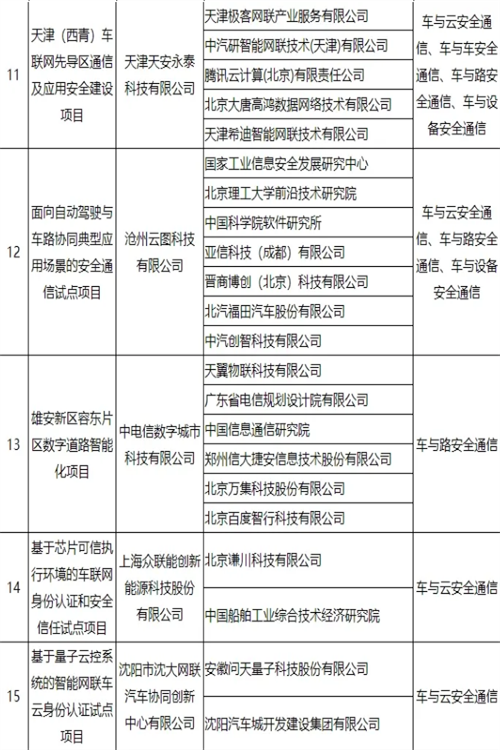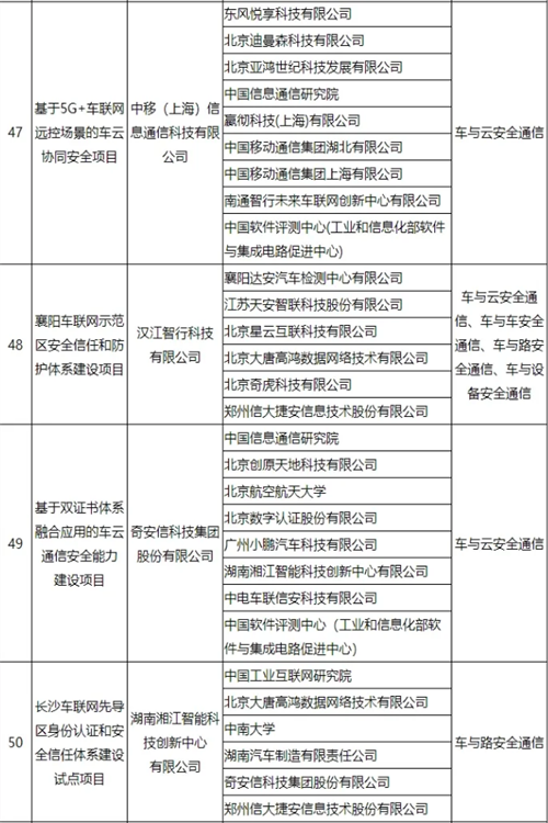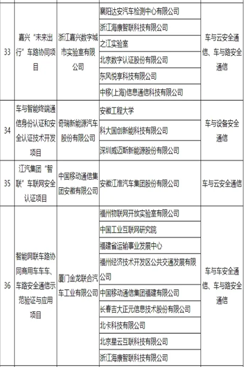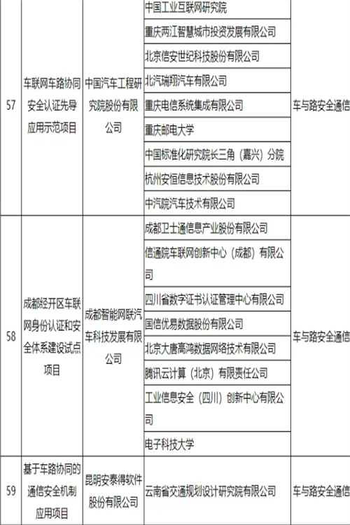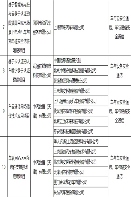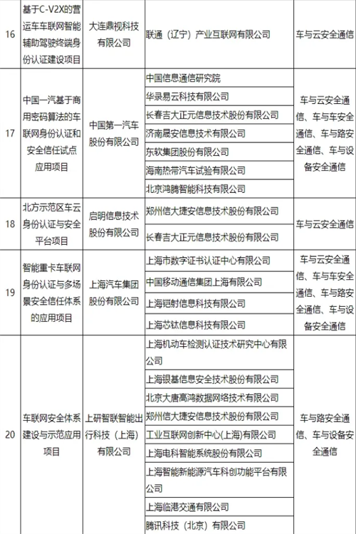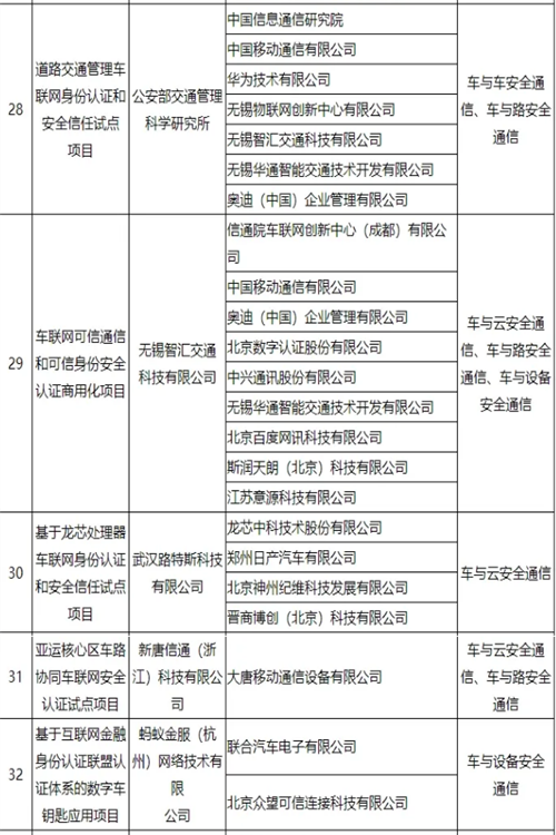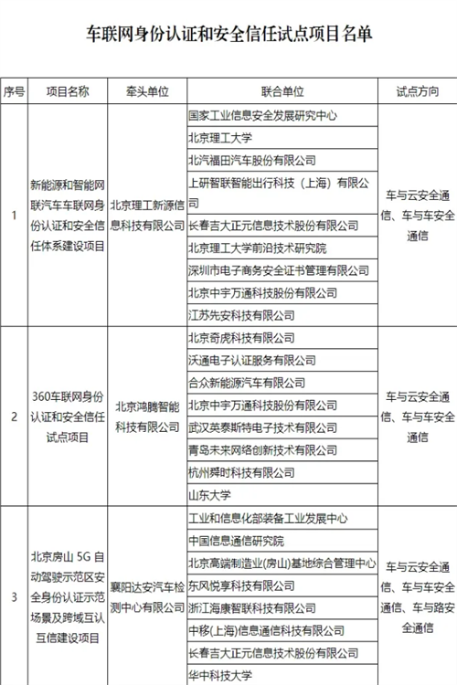 车联网身份认证和安全信任试点项目名单公布