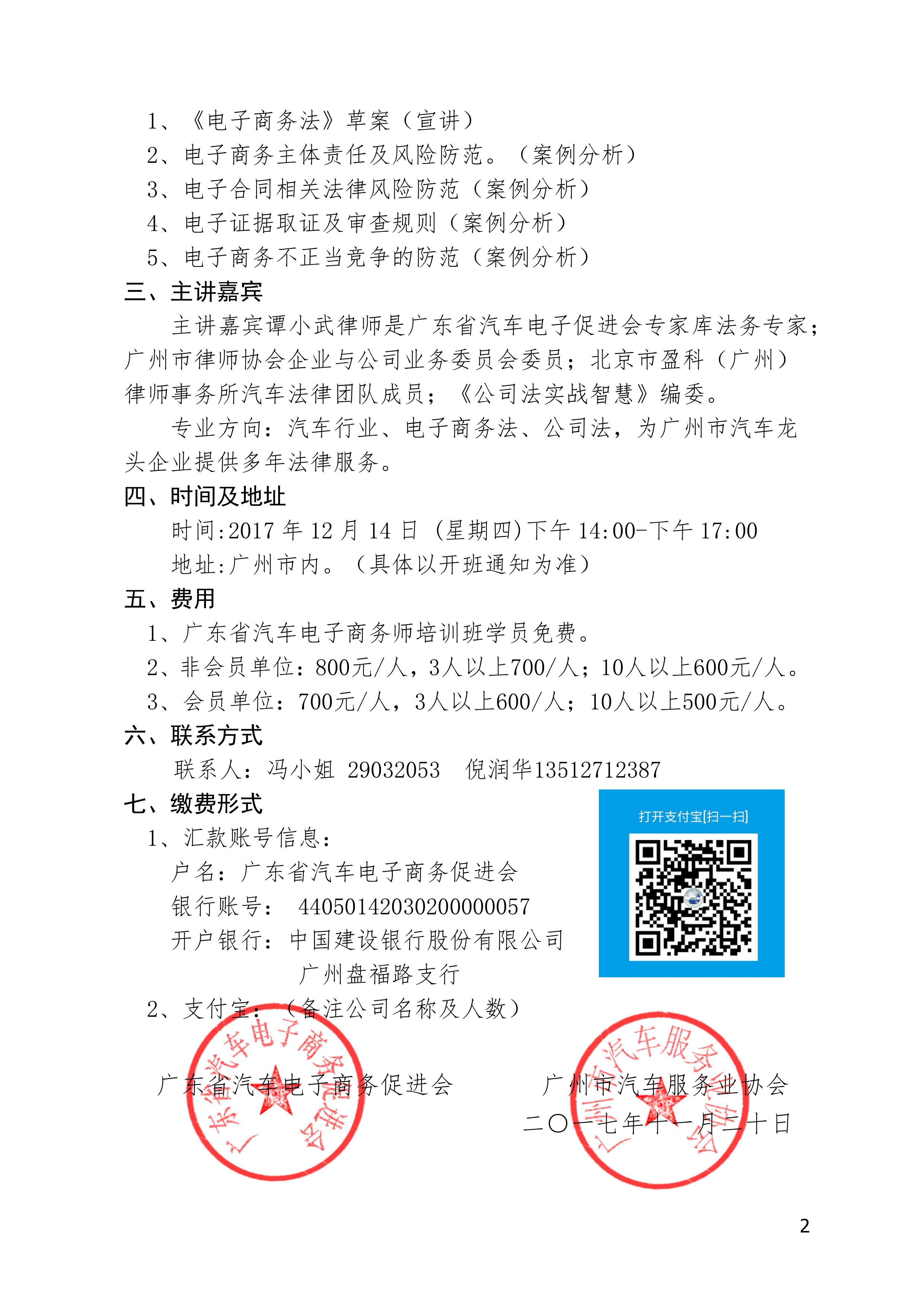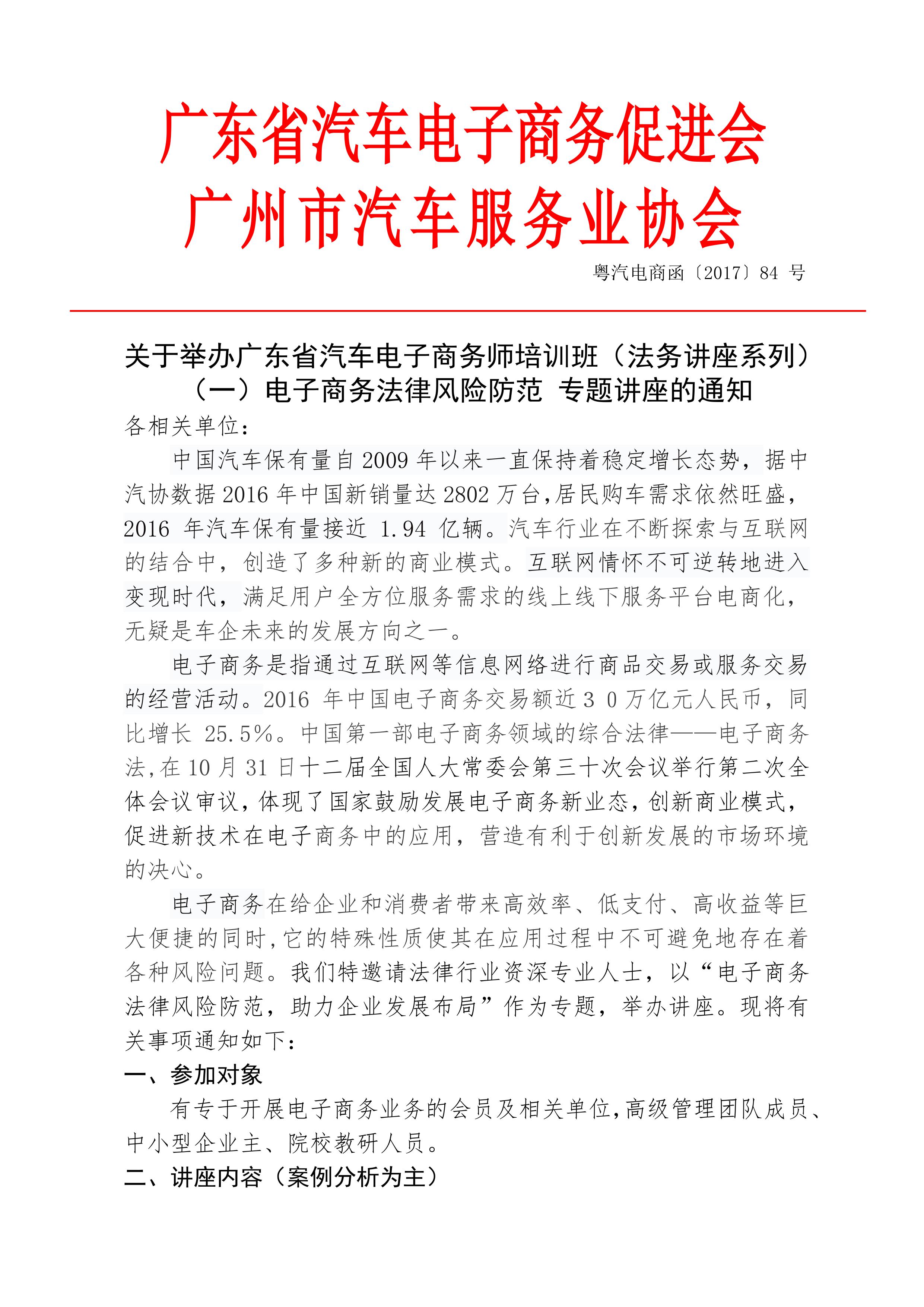 关于举办广东省汽车电子商务师培训班(法务讲座系列)(一)电子商务法律风险防范 专题讲座的通知